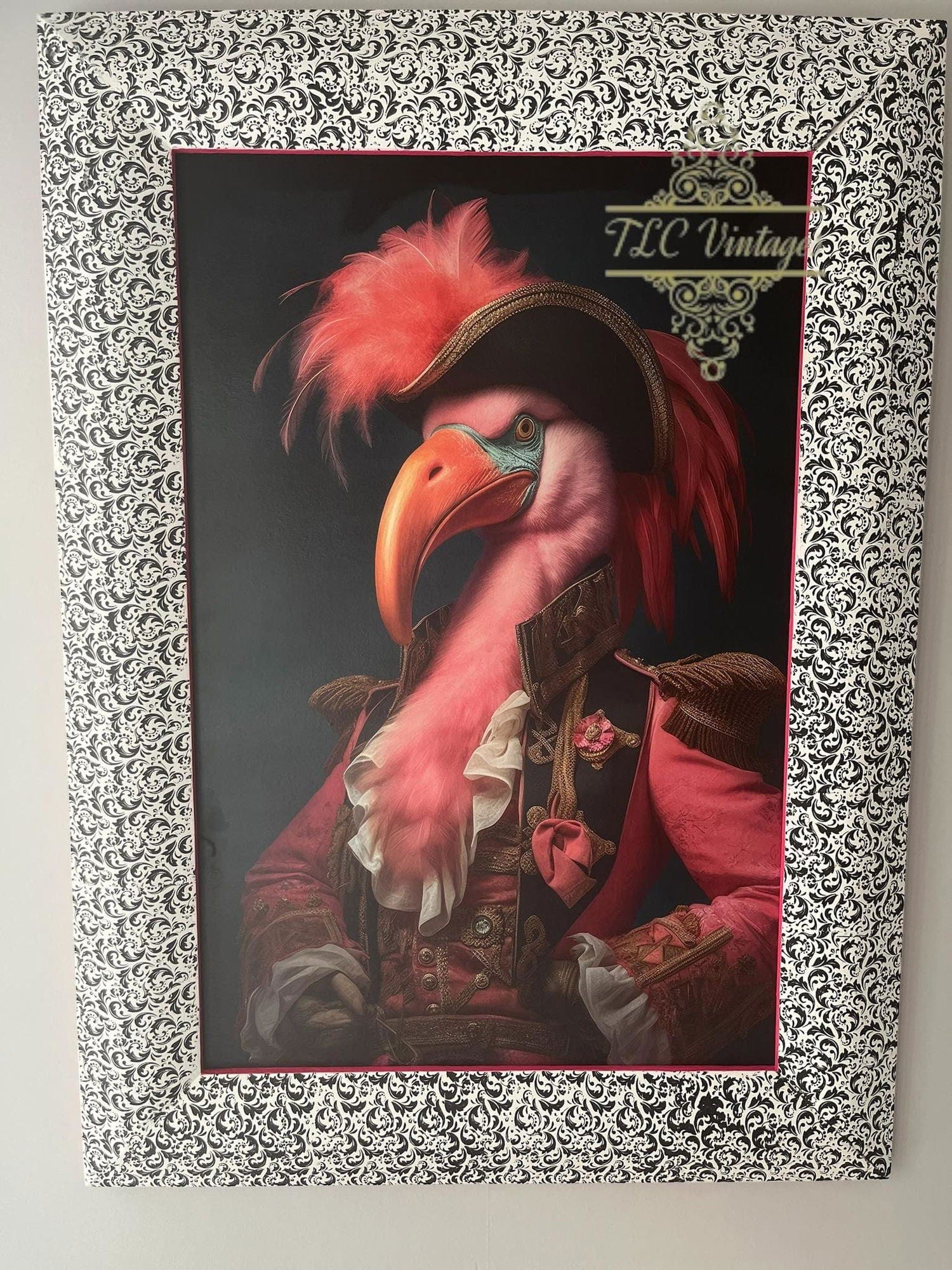 Bring a burst of flamboyant charm to your next project with Captain Featherduster, featuring a regal flamingo dressed in elaborate pirate-inspired attire. From the feathered hat to the gilded epaulets and ruffled cravat, this design radiates personality, playfulness, and bold imagination. Perfect for adding a touch of eccentric elegance to furniture, journals, wall art, and beyond.