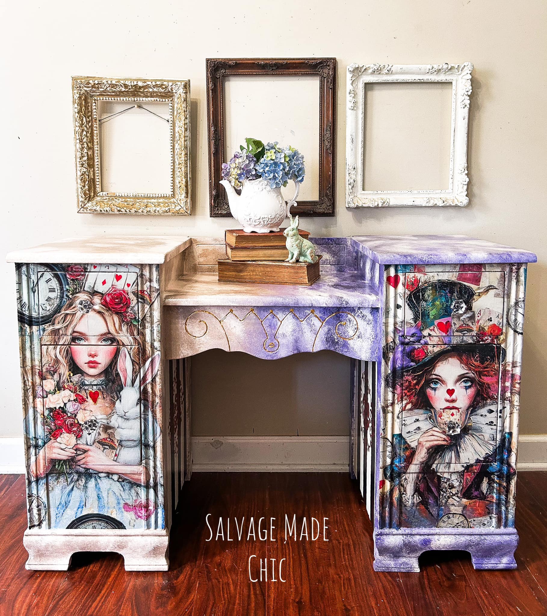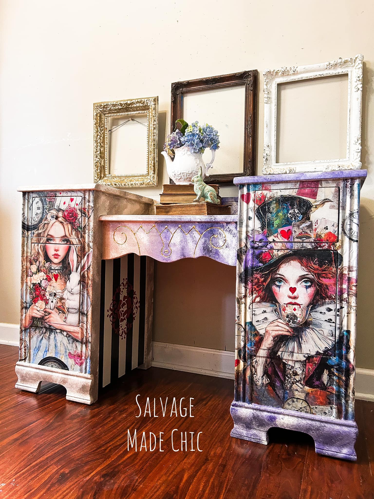 The "Allison and Mattie" duo design is a whimsical and imaginative take on a beloved childhood story. With half of the design featuring Allison, holding a rabbit amidst a flurry of cards and roses, and the other half showcasing the eccentric Mattie with his pet cat, this paper brings together charm and fantasy. Full of playful details, it’s a creative and modern twist on the classic tale. Paired with the *Whimsykel Wonderland* design, it opens up a world of possibilities for magical and enchanting projects.