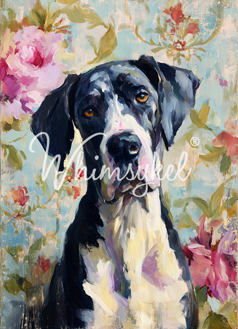 Gentle yet grand, the Great Dane design features painterly florals and soft vintage hues. Perfect for dog lovers creating bold statement pieces, decoupage furniture, or mixed-media art.