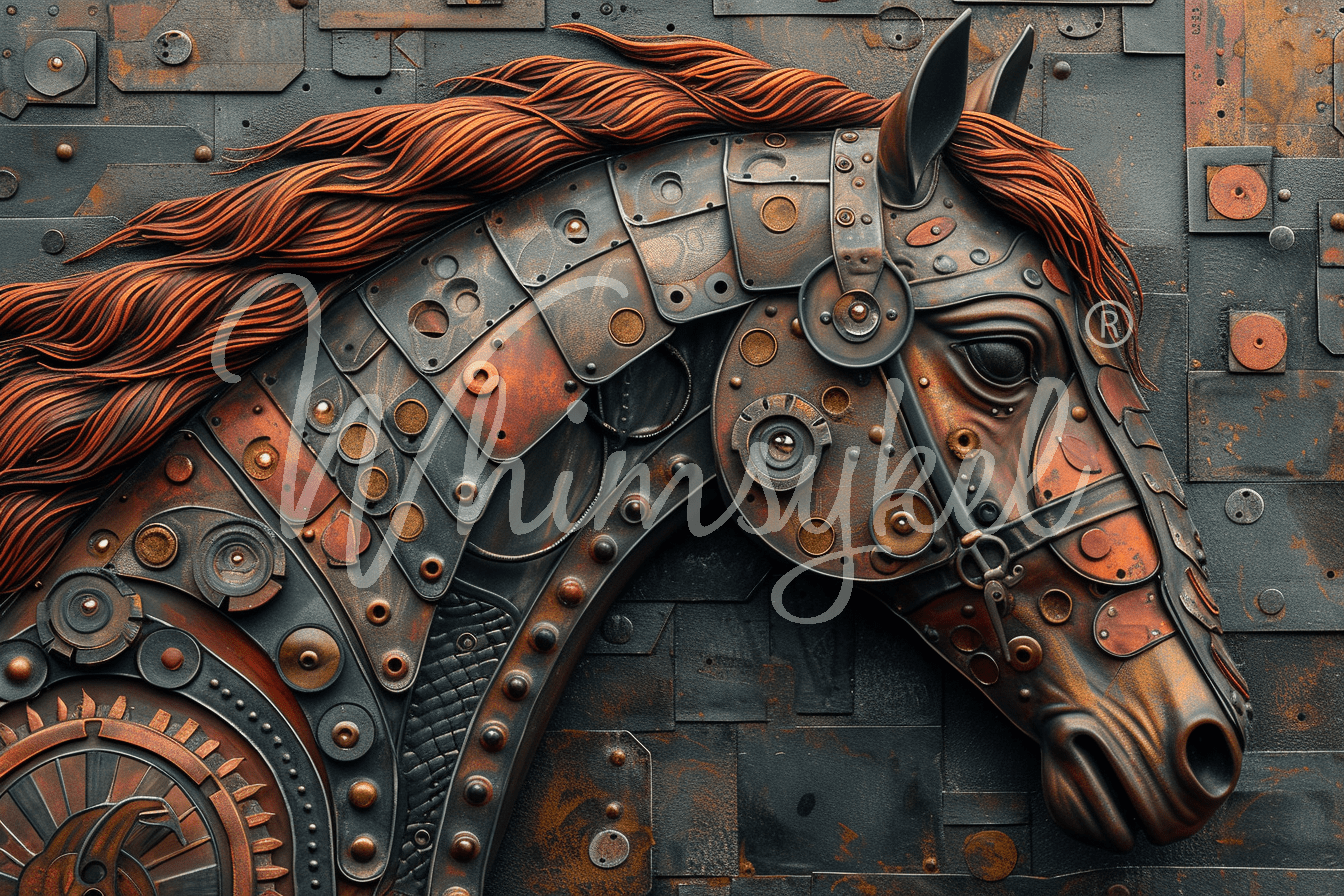 "Iron Horse" captures the essence of steampunk innovation, blending the elegance of a horse with the intricate mechanics of an industrial era. This design features a magnificent steed adorned with gears, cogs, and metallic accents, embodying the fusion of nature and technology. The detailed craftsmanship and imaginative elements create a captivating scene that transports viewers to a world where the Victorian era meets futuristic fantasy. "Iron Horse" is a celebration of creativity and mechanical artistry, offering a unique and visually stunning tribute to the steampunk genre.