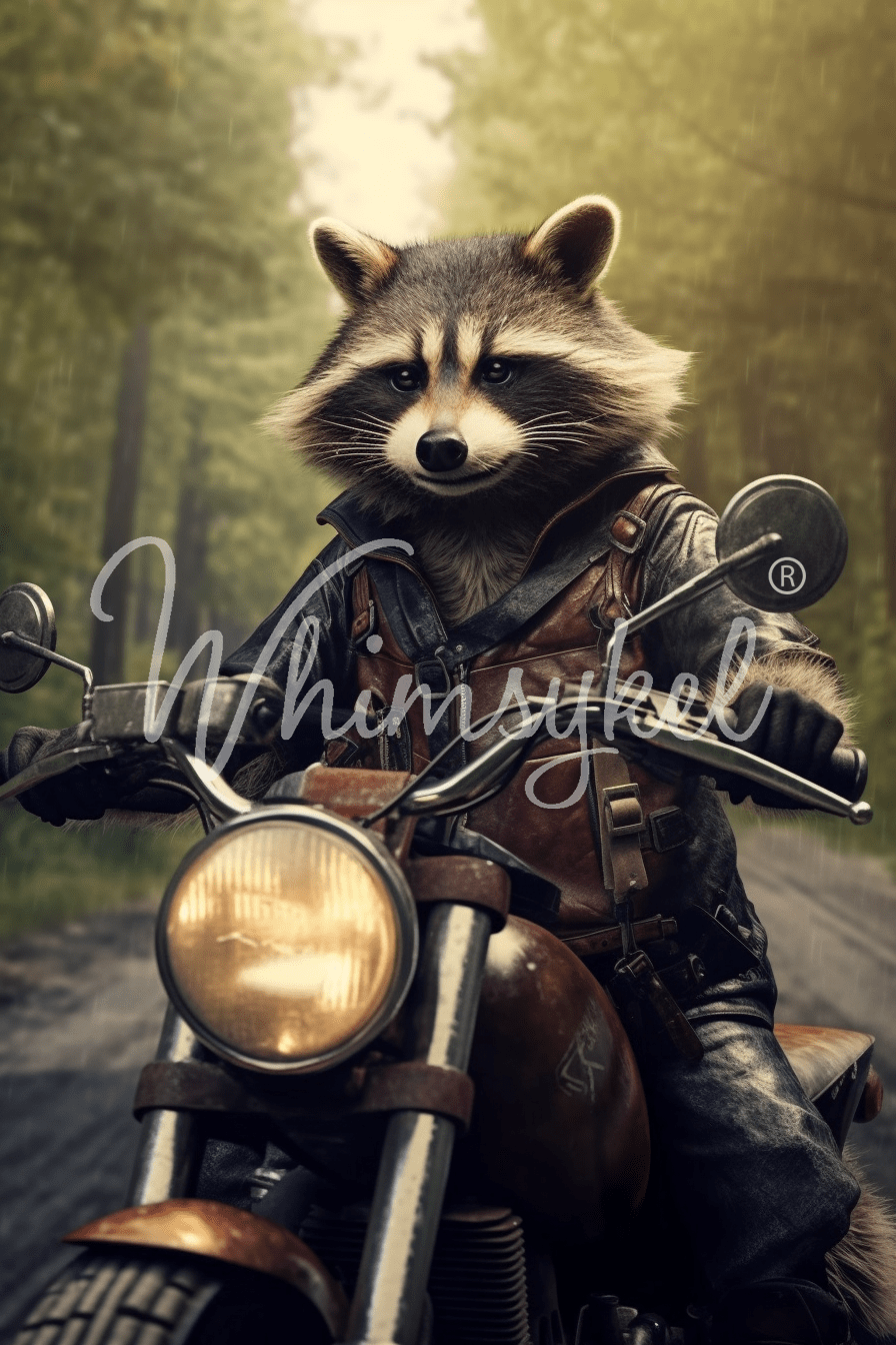 A bold blend of wild spirit and rebellious charm, this daring raccoon rides through the woods with fearless confidence. Perfect for lovers of adventure and unexpected whimsy.