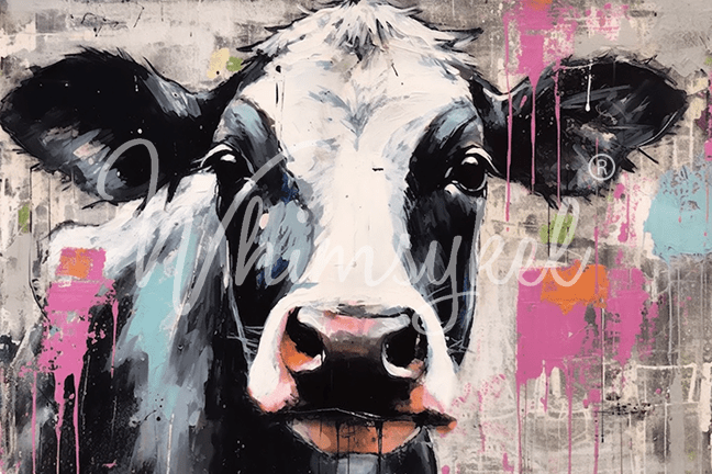 Moonique features a striking black and white cow set against a vibrant backdrop of abstract colors. The cow's simple elegance contrasts beautifully with the swirling, vivid hues, creating a dynamic and eye-catching scene. This artwork celebrates the harmony between the cow's calm presence and the lively, colorful background, inviting viewers to appreciate the blend of natural beauty and artistic expression.