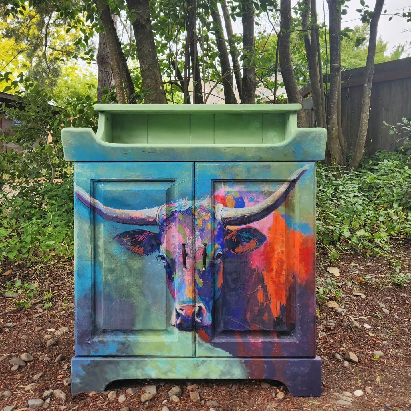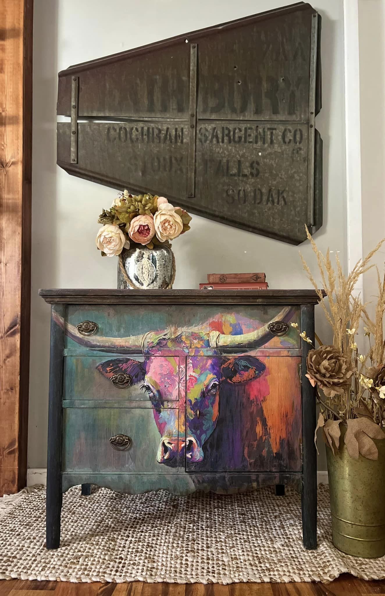 Oscar is a striking decoupage paper design featuring a colorful longhorn. The use of bold, bright colors such as oranges, blues, pinks and greens gives this design a playful and whimsical feel, making it a great addition to any room that needs a pop of color and personality. Whether displayed in a living room, bedroom, or kitchen, Oscar is sure to be a standout piece of art that adds a touch of fun and personality to any space.
