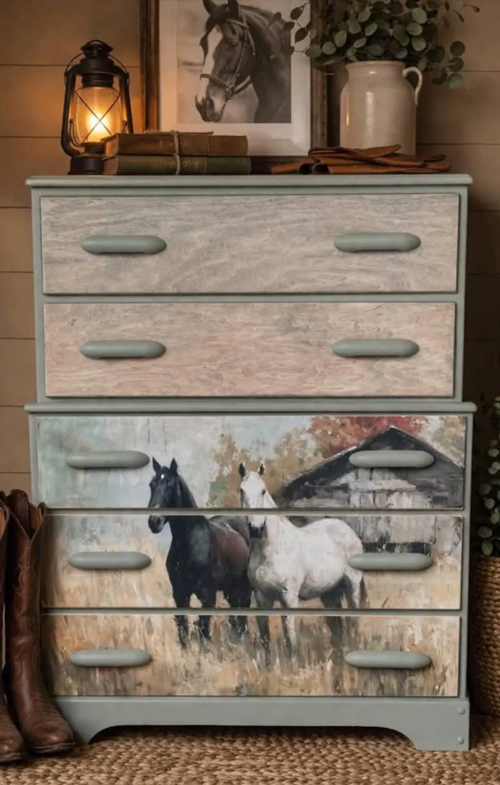 Bring rustic charm into your next project with Barnyard Companions. Featuring two majestic horses standing in a golden field beside a weathered barn, this timeless design captures the peaceful beauty of country life. Perfect for farmhouse décor, furniture art, and creative projects that call for a touch of pastoral serenity.