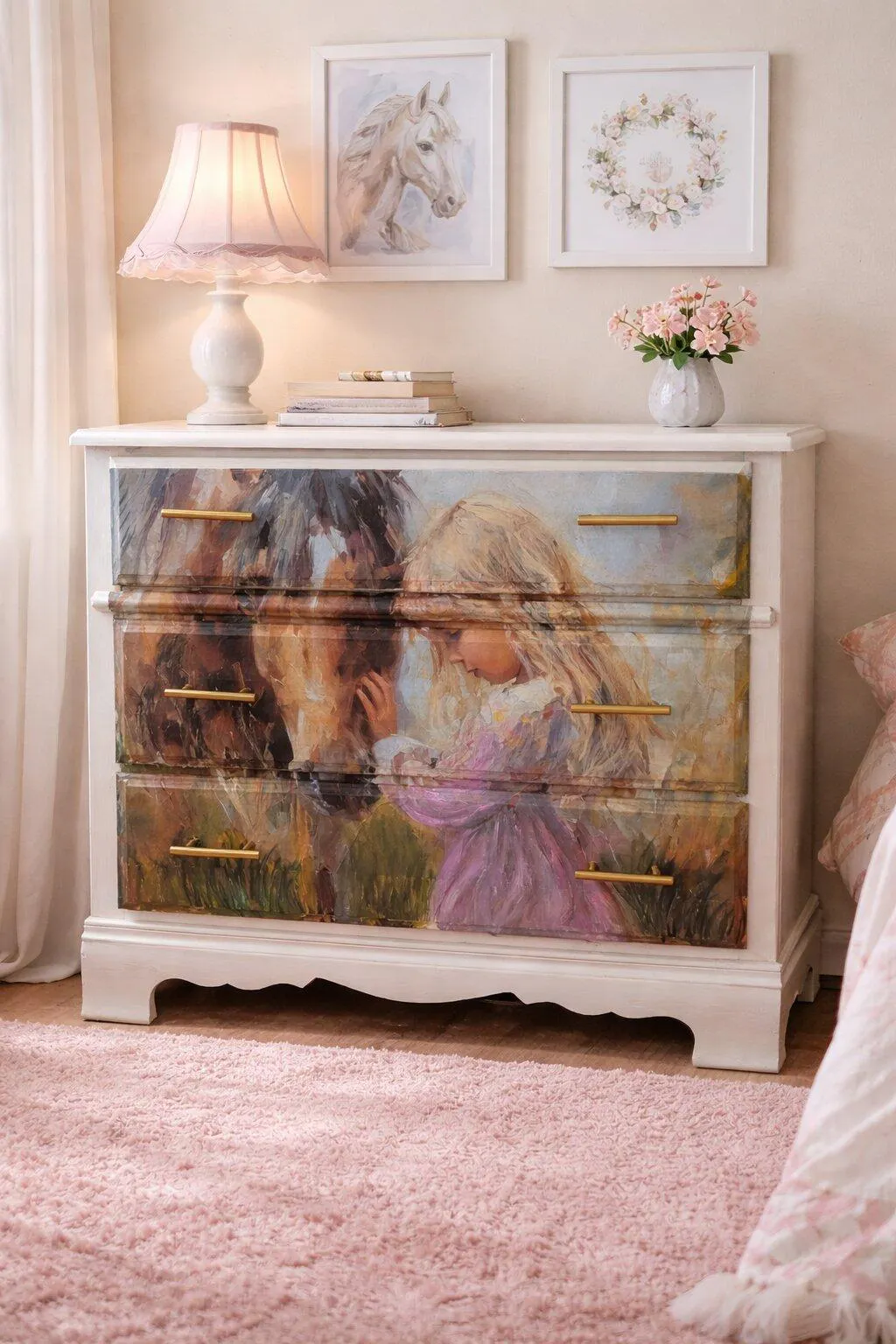 Embrace the deep connection between human and animal with The Bond, an evocative design. This impressionist-style artwork depicts a young girl in a floral dress resting her forehead against a chestnut horse, capturing a moment of pure trust and affection. Soft golden tones and expressive brushstrokes make it an ideal choice for farmhouse, western, or equestrian-themed projects, from DIY furniture to heartfelt wall art.